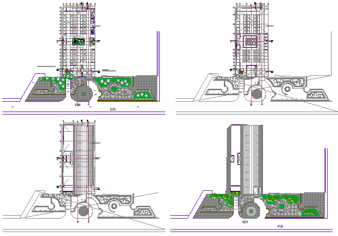 Multi-flooring shopping mall elevation and sectional details that includes a detailed view of front and back elevations, front and back sectional view, tree view, flooring view, car parking view, landscaping view, doors and windows view, staircase view and much more of shopping mall project.