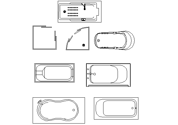 Bath tub top view details, various sizes and shapes of bath tub are shown