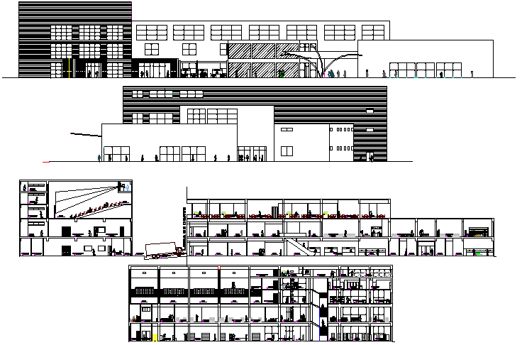 All sided elevation and sectional details of multi-story shopping center dwg file