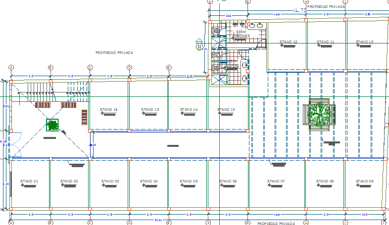 First floor layout plan details of two-story shopping center that includes a detailed view of main entrance and exit gate, waiting area, general hall, passage, shops and showrooms, corporate offices, food store, toilets and much more of shopping center project.