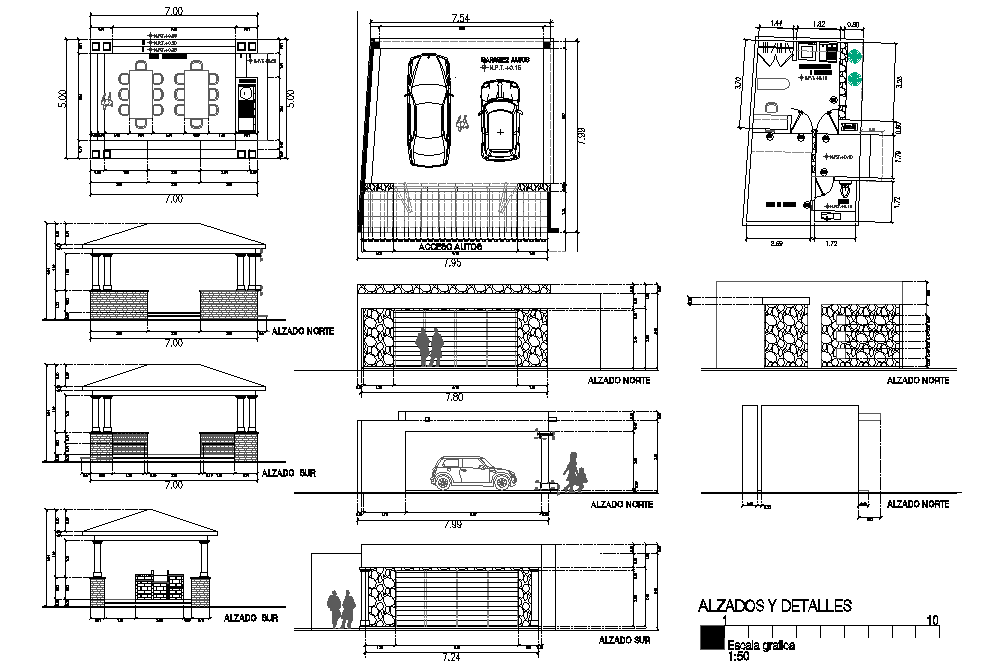 Plan and elevation house plan detail dwg file, front elevation detail, left side elevation detail, right elevation detail, back elevation detail, car parking detail, scale 1:50 detail, furniture detail in table, chair, door and window detail, etc.