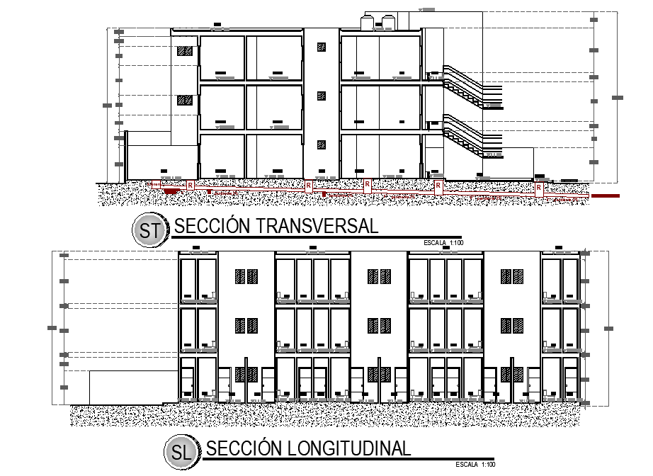 Section department house plan layout file, section A-A’ detail, section B-B’ detail, scale 1:100 detail, furniture detail in door and window detail, dimension detail, naming detail, stair detail, hatching detail, etc.