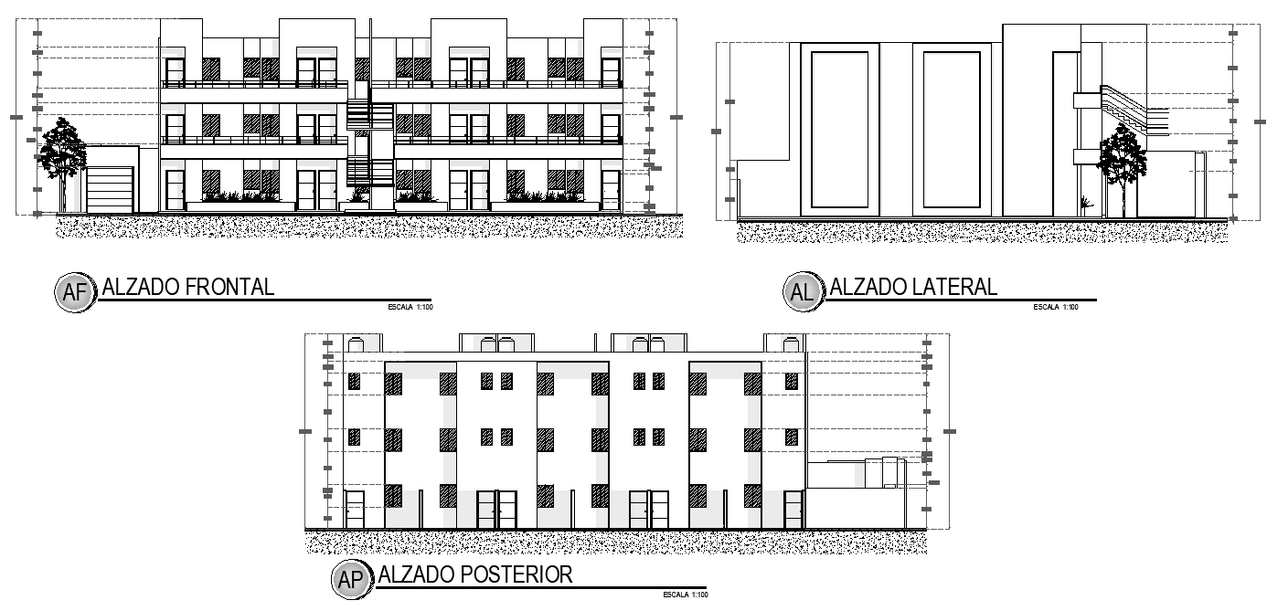 Elevation department house plan autocad file, front elevation detail, side elevation detail, back elevation detail, scale 1:100 detail, dimension detail, naming detail, landscaping detail in door and window detail, stair detail, landscaping detail tree and plant detail, etc.