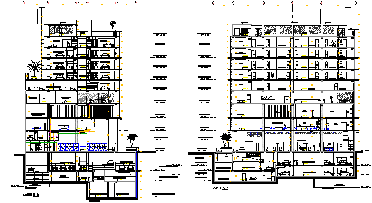 5 stars hotel section plan autocad file, section A-A’ detail, section B-B’ detail, leveling detail, dimension detail, naming detail, furniture detail in door, window, table, chair, sofa and bed detail, basement level detail, etc.