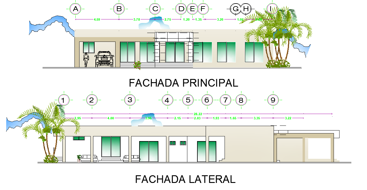 Elevation house 3 bed room plan layout file, front elevation detail, side elevation detail, landscaping detail in tree and plant detail, centre line plan detail, car parking detail, furniture detail in door, window and sofa detail, etc.