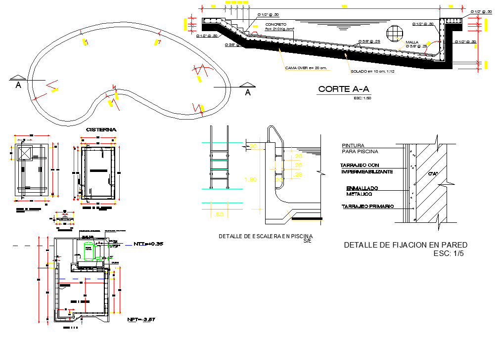 Wall fixing and tank plan layout file, tank plan and section detail, dimension detail, naming detail, scale 1:5 detail, reinforcement detail, naming detail, leveling detail, etc.