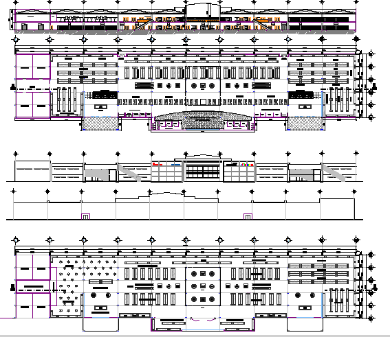 Sector commercial shopping center architecture project that includes a detailed view of front and back elevations, front and back section, flooring view, roof or terrace view, dome view, doors and windows view, car parking view, staircase view, balcony view, shops and showrooms, offices, mini garden and much more of shopping center project.