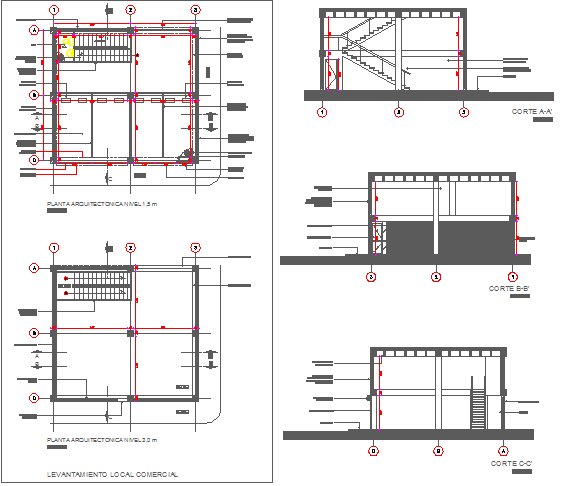 The architecture project details of store of security implements that includes a detailed view of all sided sectional view details, flooring view, wall sections, dimensions, measures, staircase, doors and windows, layout plan details with office, sanitary and much more of store project.