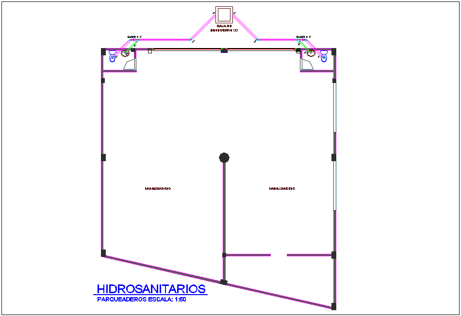 Parking plan hydro sanitary view for multi housing with commercial area dwg file in plan with parking area view with wall and support area view with washing area view with sanitary line view with double