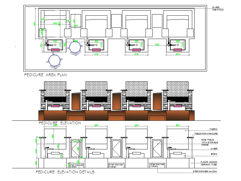 Pedicure area plan & Elevation design, pedicure area plan, pedicure elevation details, table for manicure, side table with storage inside, step drawer h=15cm .