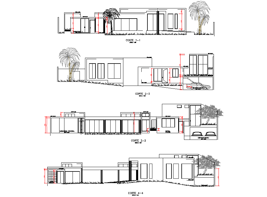 Section residence house plan layout file, section 1-1’ detail, section 2-2’ detail, section 3-3’ detail, section 4-4’ detail, landscaping detail in tree and plant detail, dimension detail, naming detail, car parking detail, etc.