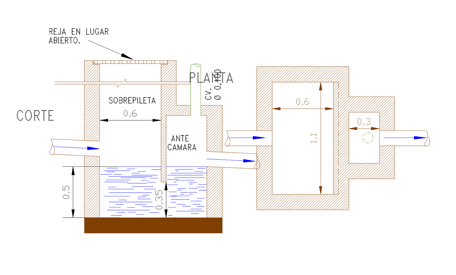 Camera with a hydraulic close plan. Elevation with the detailing of dimension, grate in open lungar, before a camera, over pile, etc.,