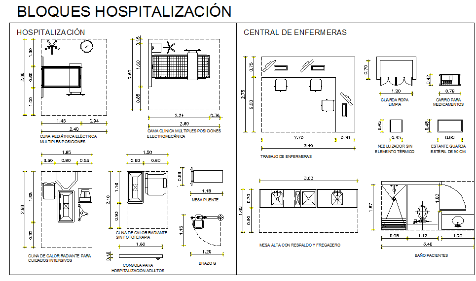 Hospitalization block detail. electrical pediatric cushion multiple positions, clinical bed multiple electro mechanical positions, high table with back and sink, etc.