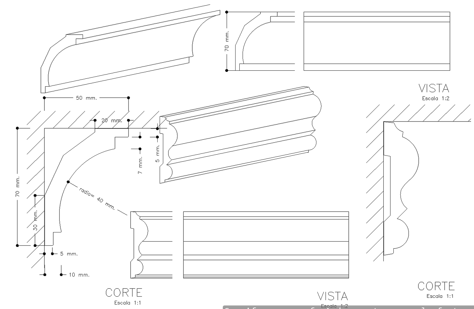 Moulding of plaster plan. Plan with sections detailing, dimension detailing, moulding detail, etc.,