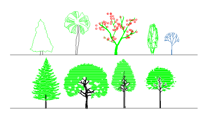 Plantation and trees details,here there is front elevation of trees and types in auto cad format