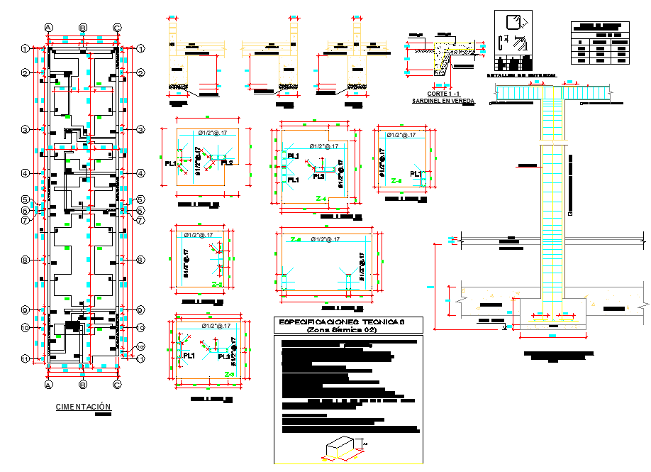 Foundation plan and section detail dwg file, centre lien plan detail, dimension detail, naming detail, reinforcement detail, bolt nut detail, specification detail, bolt nut detail, etc.