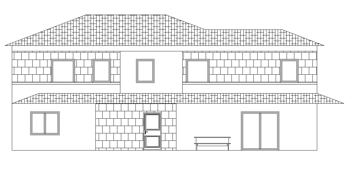 Front elevation home plan layout file, furniture detail in door and window detail, roof plan detail, brick wall detail, etc.