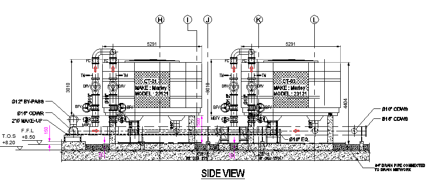 Side view of cooling tower section details,here there is side elevation of cooling tower , each and every details are shown