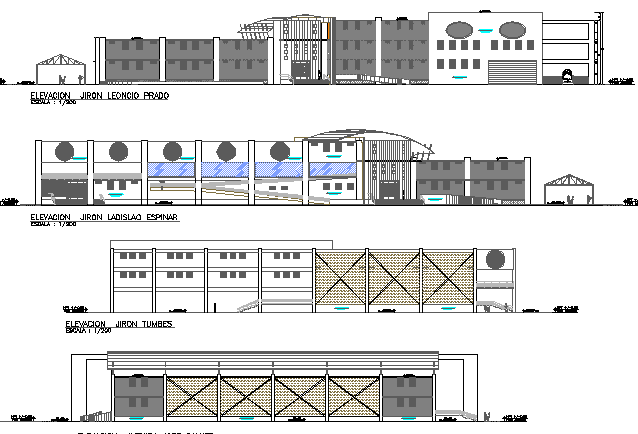 Multi-level super market elevation and sectional details that includes a detailed view of front and back elevations, front and back sections, dome view, guard cabin, flooring view, tree view, car parking view, doors and windows view, terrace view and much more of super market project.