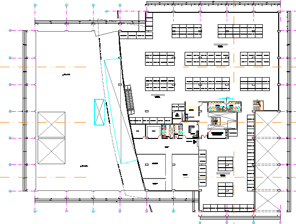 Third floor layout plan details of shopping center that includes a detailed view of main entry gate, exit gate, theater, fast food stores, indoor staircases, shops and showrooms, sanitary facilities for male and females, seating area, waiting area, general hall, brand stores, elevators, departmental stores, lobby, passage and much more of super market project.