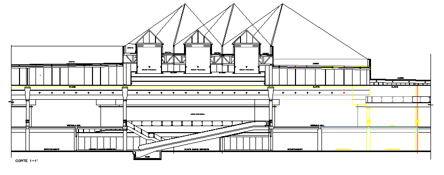 Multi-level shopping center main elevation view that includes a detailed view of main elevation, flooring view, doors and windows view, roof or terrace view, balcony view, dome view and much more of shopping center elevation.