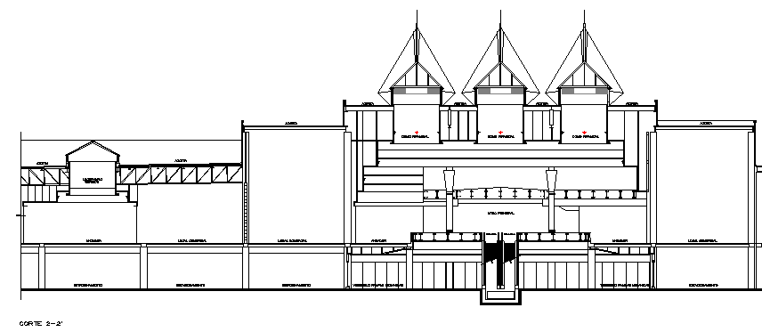 Front elevation view of multi-flooring shopping mall that includes a detailed view of main elevation, flooring view, doors and windows view, roof or terrace view, balcony view, dome view and much more of shopping mall elevation.