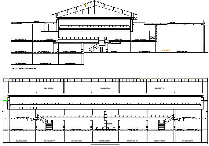 Front and back sectional view details of shopping mall that includes a detailed view of front section, back section, flooring view, staircase view, doors and windows view, roof view, departmental stores, shops and showrooms and much more of shopping mall project.