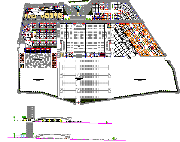 Commercial multi-flooring building auto-cad details that includes a detailed view of front elevation view, back elevation view, outdoor and indoor roads, green area, landscaping view, tree view, specified car parking space, car ramps and much more of commercial building project.