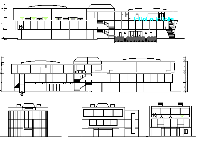 Three level shopping center elevation and sectional details that that includes a detailed view of front and back elevation, front and back sections, flooring view, doors and windows view, roof or terrace view, balcony view, dome view and much more of shopping center project.