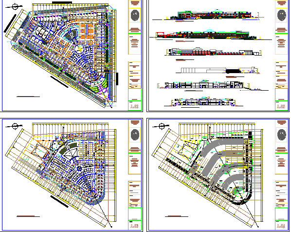 Multi-level shopping center architecture project that includes a detailed view of front and back elevation and sections with flooring view, doors and windows view, roof or terrace view, balcony view, dome view, basement floor of car parking, entry and exit gate, car ramps, specified car space, shops and showrooms, departmental stores, indoor staircases, elevators, restaurant, fast food stores, theater and much more of shopping center project.