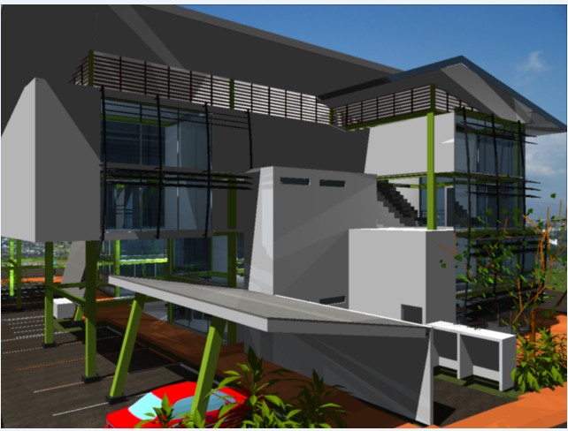3d design of side view of shopping center that includes a detailed view of tree view, car parking view, glass wall view, doors and windows view, roof view and much more of shopping center project.
