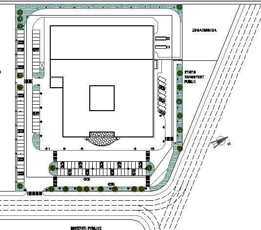 Ground floor layout plan details of shopping center that includes a detailed view of outdoor and indoor roads, guard cabin, tree view, car parking space, landscaping view and much more of shopping center project.