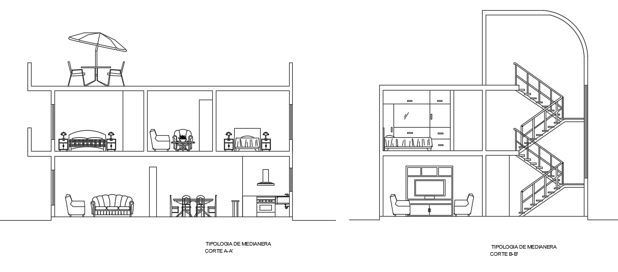 Single Family Residence project dwg file. Includes section A-A and section B-B, furniture detail in a table, sofa, chair, bed, cupboard detail,Staircase etc in autocad format.