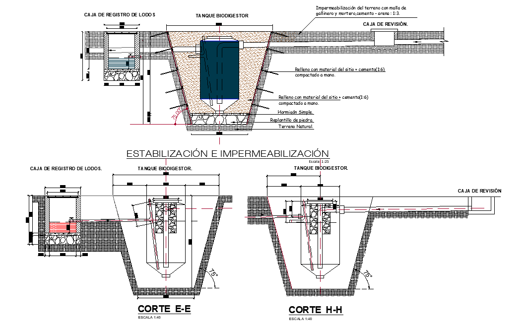 Underground tank plan and section autocad file, section E-E’ detail, section H-H’ detail, dimension detail, naming detail, stone detail, soil detail, radius detail, etc.