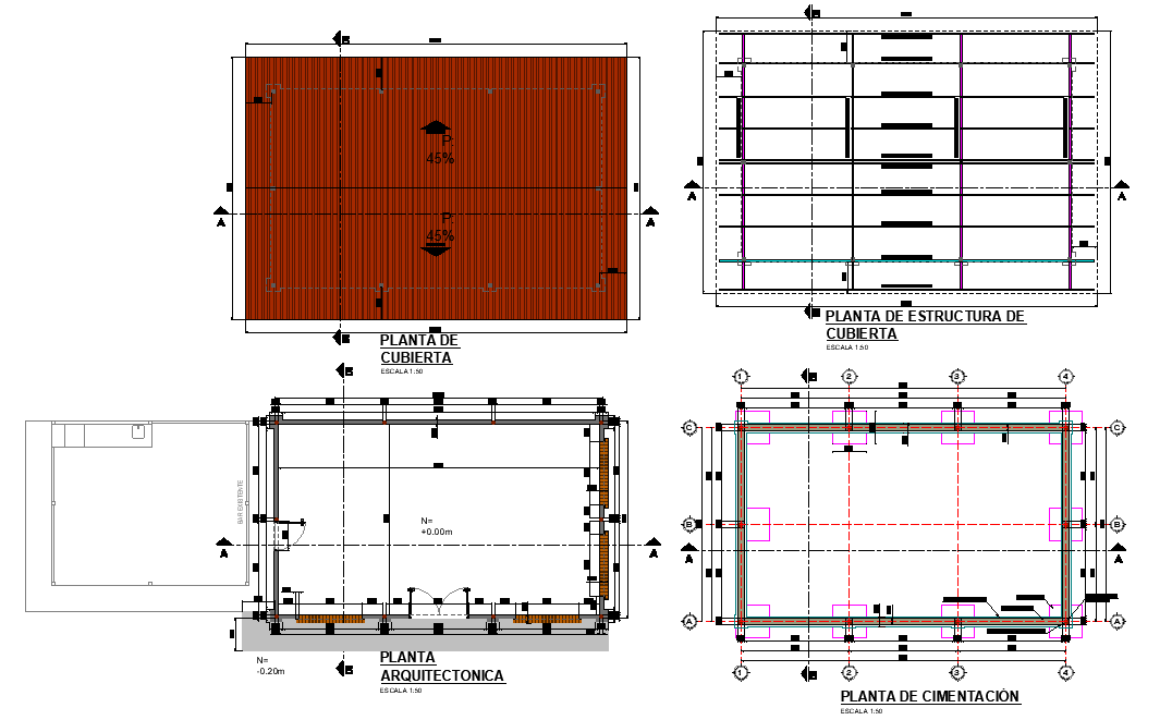 Foundation and roof plan layout file, section line detail, dimension detail, naming detail, scale 1:50 detail, reinforcement detail, etc.