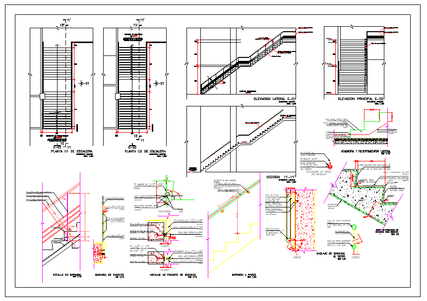 Structure Stair Detail with section. previous anchorage in the slab,minimum 15 cm., railing wall anchor, 1 1/2 "x 3/8" stainless steel intern, welded to the bars.