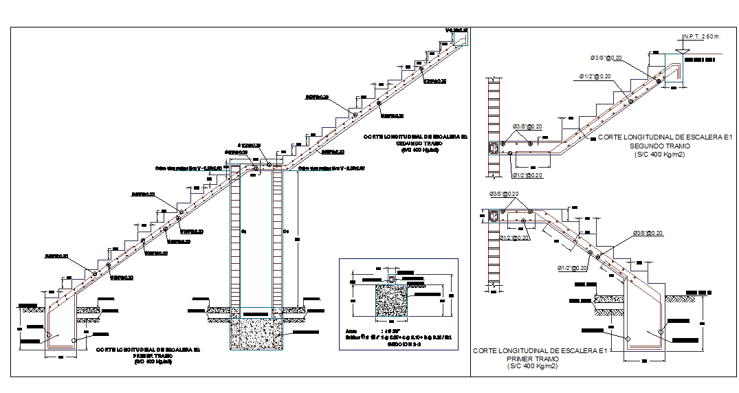 Stair Construction Detail in autocad file. longitudinal cut of stair e2, Sobre viga perimetrica V - 0.25x0.60, longitudinal cut of stair e2, stairs 2nd, 3rd, 4th similar floor etc.