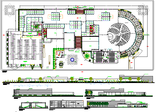 All sided elevations, section and structure plan details of shopping mall dwg file