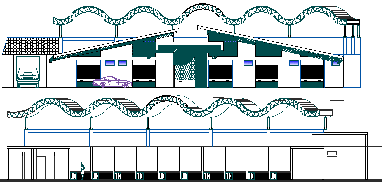 Cut side elevation view details of central shopping center that includes a detailed view cut elevation view with roof design view, terrace view, wall design, flooring view, car parking view, doors and windows view, staircase view and much more of shopping center project.