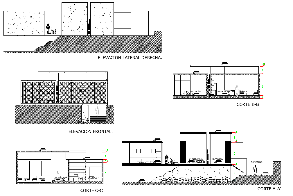 Elevation and section home autocad file, front elevation detail, side elevation detail, section A-A’ detail, section B-B’ detail, section C-C’ detail, dimension detail, stair detail, hatching detail, furniture detail in table, chair, door and window detail, etc.