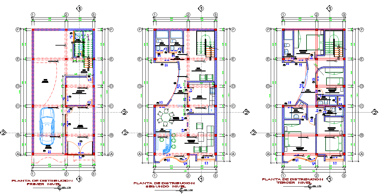 Family house plan detail dwg file, section line detail, centre line detail, dimension detail, car parking detail, furniture detail in door, window, cub board, drover, bed and sofa detail, stair detail, scale 1:50 detail, etc.