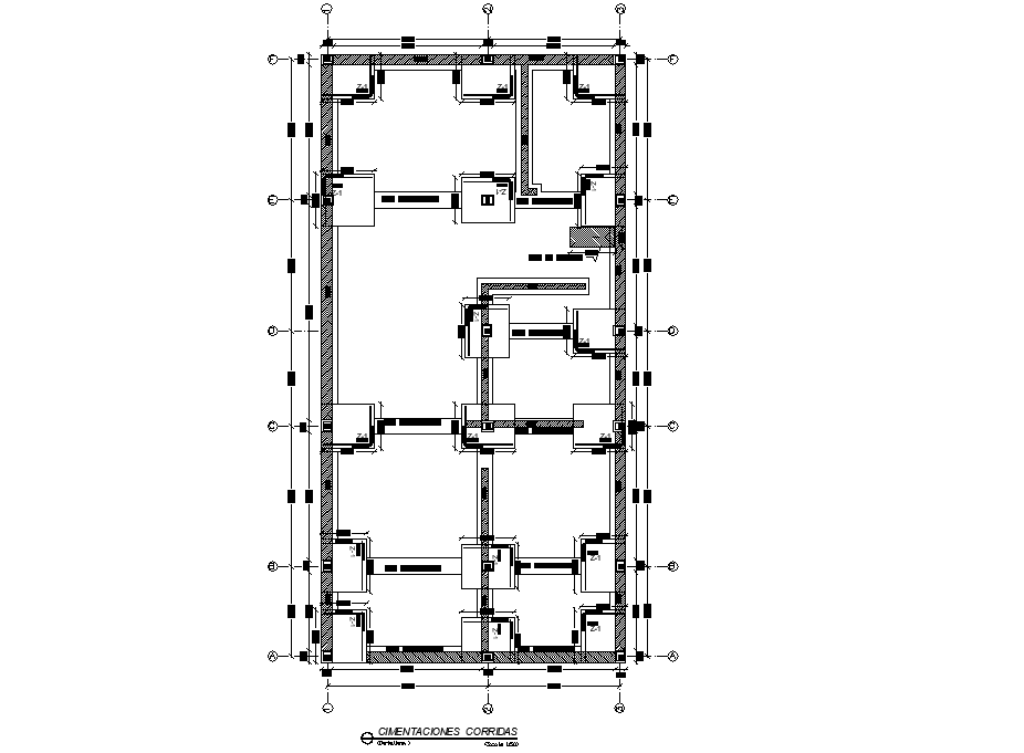 Foundation plan autocad file, centre line plan detail, dimension detail, naming detail, scale 1:50 detail, reinforcement detail, etc.