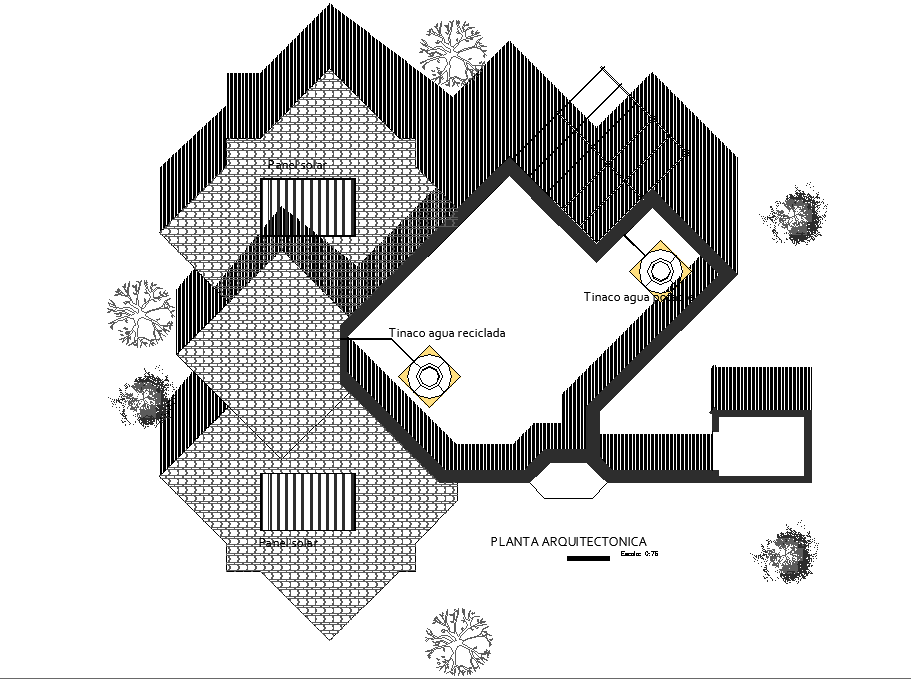 Architect house plan autocad file, hatching detail, landscaping detail in tree and plant detail, scale 1:75 detail, etc.