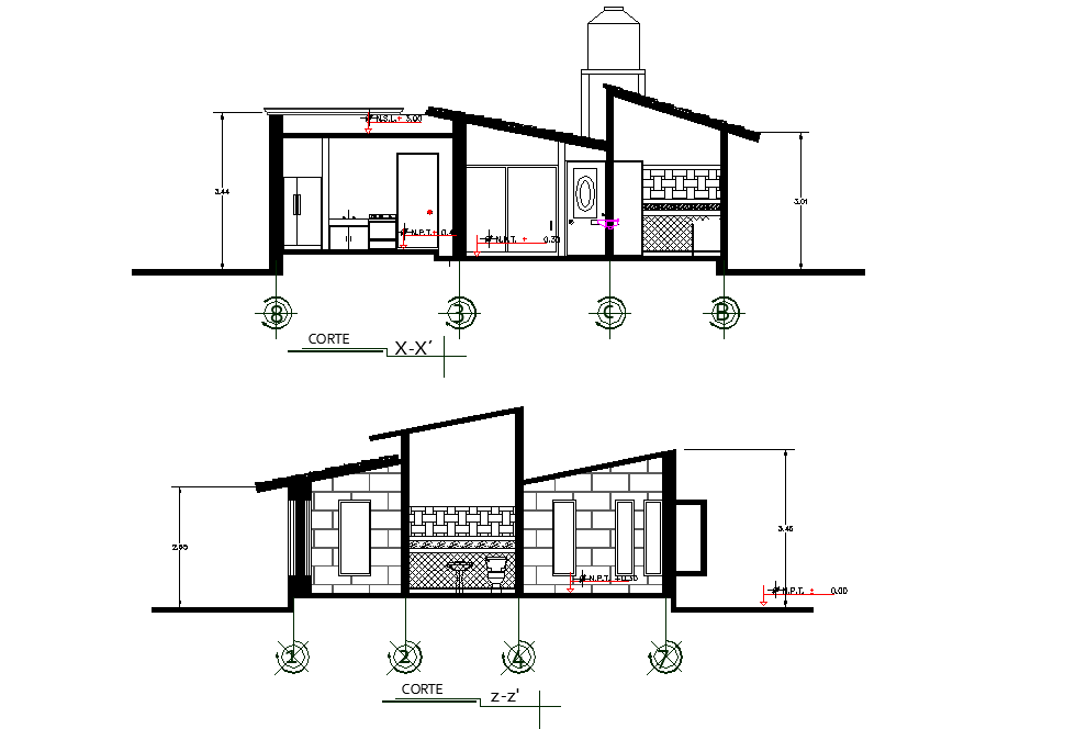 Section bioclimatic plan dwg file, section X-X’ detail, section Z-Z’ detail, centre line plan detail, leveling detail, dimension detail, furniture detail in door and window detail, naming detail, toilet detail in water closed detail, sink detail, etc.