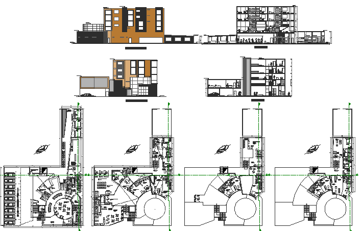Strip mall center elevation, section and floor plan details that includes a detailed view of front and back elevations, front and back sections, flooring view, doors and windows view, staircase view, tree view, car parking view, wall design, shops and showrooms, corporate offices, theater, food stores and much more of shopping mall project.
