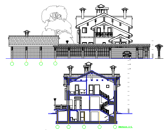 Front sectional details of building,there is complete interior detail of a bungalow, showing furniture detailing, landscaping etc