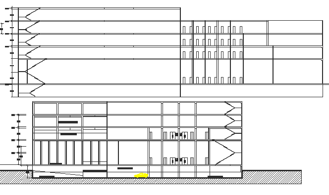 Front and back sectional view of proposed shopping mall that includes a detailed view of front section, back section, flooring view, doors and windows view, wall design, indoor staircase view, roof or terrace view and much more of shopping mall project.