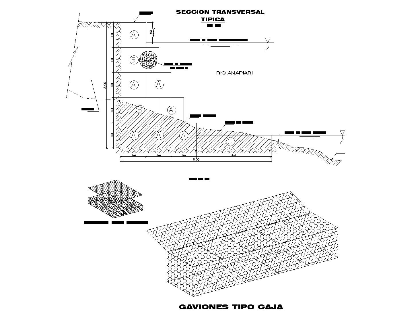 Gabion detail dwg file, elevation detail ,isometric view,with measurement detail etc