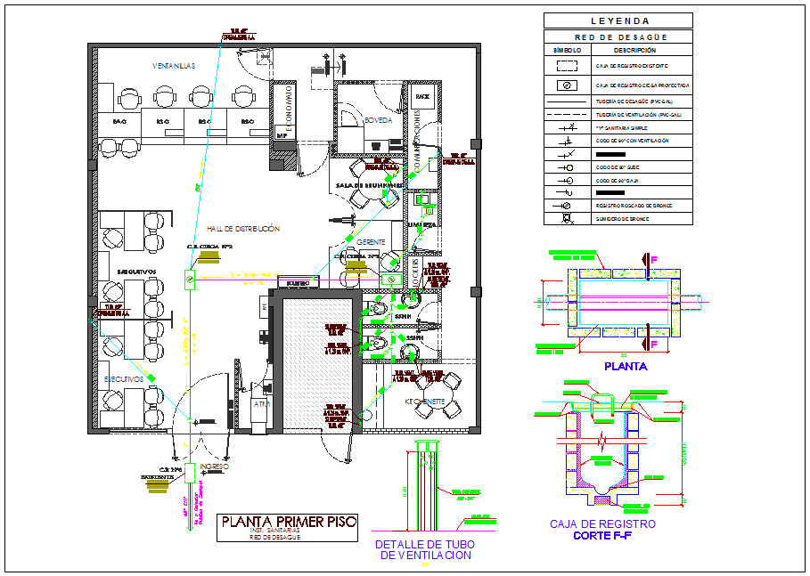 Installation sanitary drain network for office dwg file in plan with view of office area with wall and distribution view and view of washing area with sanitary view with drainage line network view of water with single water line with legend and necessary dimension.