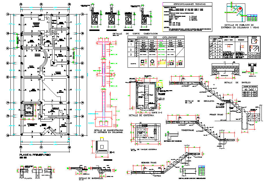Staircase and Foundation plan autocad file, centre line plan detail, dimension detail, naming detail, riser and trade detail, specification detail, column section plan detail, bolt nut detail, cut out detail, foundation plan and section detail, etc.